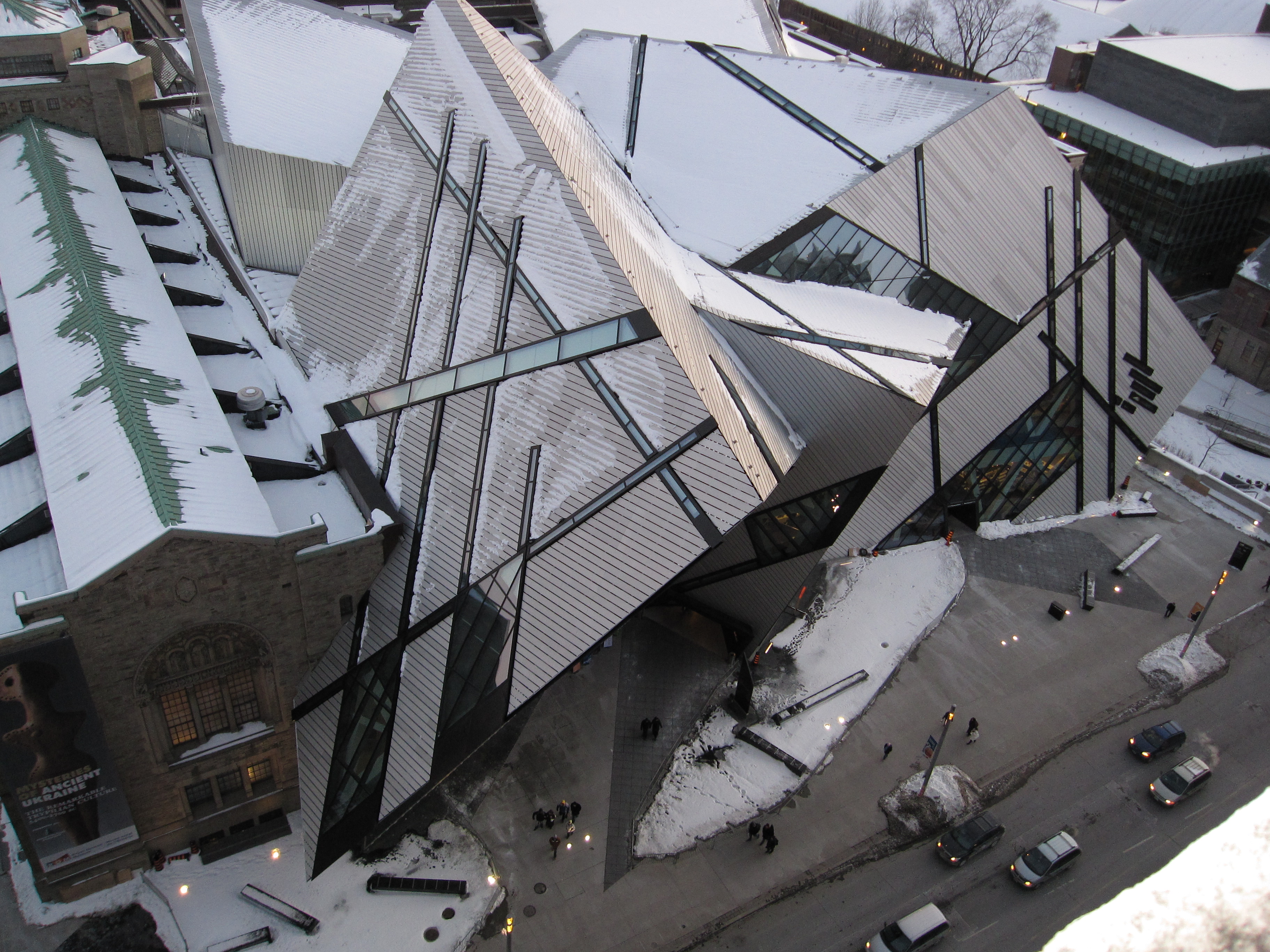 Few things in life are ever crystal clear.  But clear crystal is a beautiful thing. The beauty in crystal lies in its clarity and it’s perfectly symmetrical design.  The sparkle, the bling factor makes crystal appealing and eye-catching.  Think crystal chandeliers, crystal decanters, the crystal ball and most recently the liquid crystal display (LCD) television.  So why is it that ‘The Crystal’, the new Daniel Libeskind architectural expansion at the ROM (Royal Ontario Museum) is so controversial?  Cantilevered out over Bloor St. in downtown Toronto, the Crystal’s overall aim was to provide openness and accessibility and to transform the entire museum complex into a dynamic centre of people, events and artifacts.  To re-vitalize it.  The ROM was originally built in 1914 in the style of Neo-Romanesque and the 1933 expansion was built in the Neo-Byzantine style.  Both styles lean toward a heavy, fortress-like design.  The new 2007 expansion by comparison is very different and diverse.  Very outrageous.  But original and new.  Shouldn’t we begin to marry the old with the new?  Not hang around in the ‘Romanesque’ period but carve out a new path?  A new style.  Something that reads ‘Modern’?  Aren’t we in a new Millennium?  Shouldn’t we leave our own mark?  Let me know what you think.  Is ‘The Crystal’ a forward thinking design….or not??