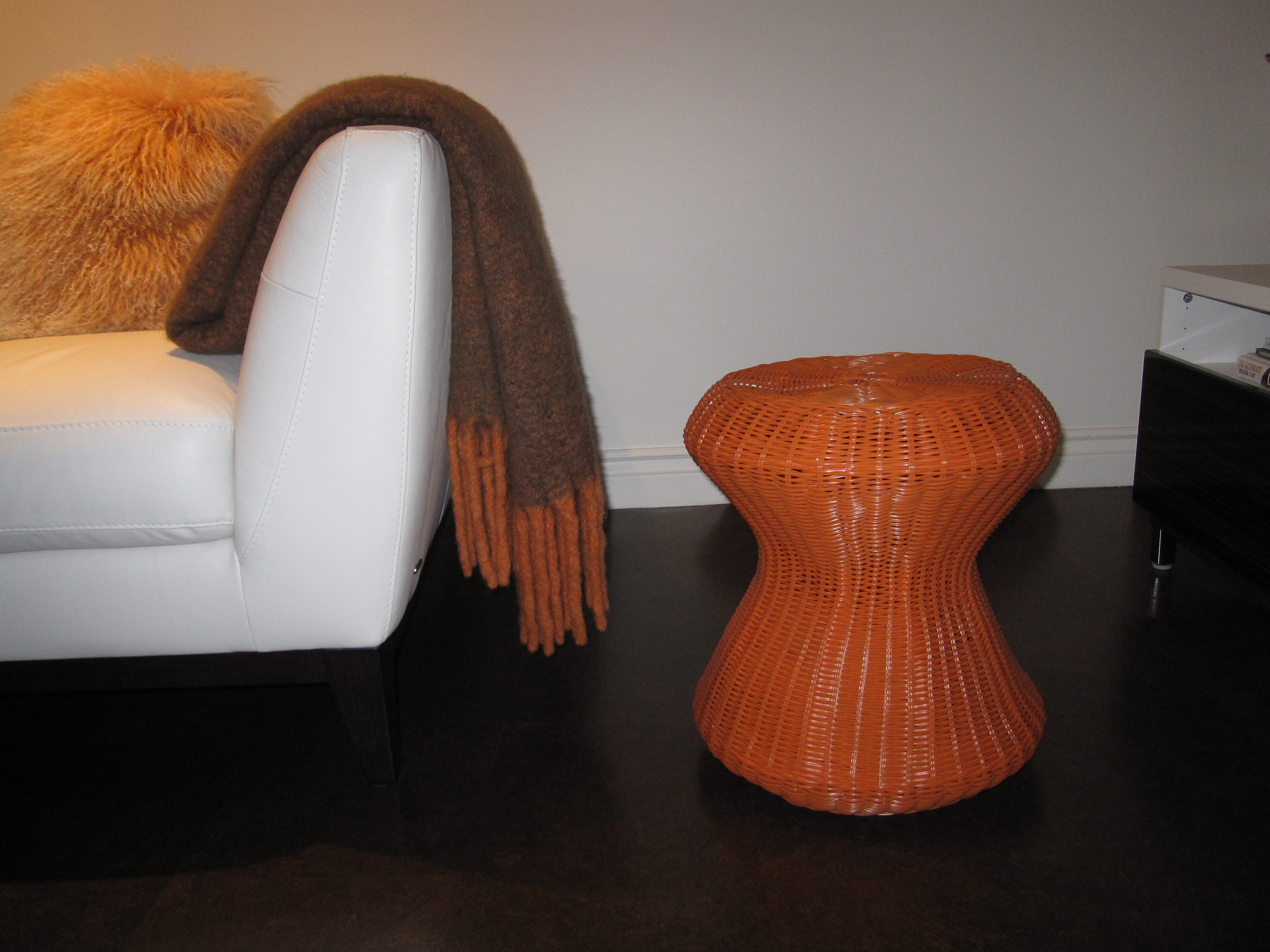 Okay by now you know I love orange. Orange as an accent that is. I have had a red sofa but I am not sure if I could do a large investment piece in orange. i.e. An entire sofa in orange, but never say never. I recently bought a small orange stool to park next to my white leather sectional. I had been looking for some time but could not find exactly what I was looking for. Viola! There it was. I believe in always waiting to find exactly what you want. This stool is very organic in shape and texture so next to the square lines of the sectional it looks good. It is also a wonderful piece to rest my feet on when lounging and is strong enough to serve as an extra chair pulled up to the desk.