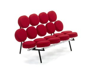 But these are not the real Marshmallow Sofas.  The first Marshmallow sofa was designed in 1956 by George Nelson and Irving Harper and was officially known as the Marshmallow love seat #5670.  The designers were approached by an inventor who had created an injection plastic disc that he insisted could be produced inexpensively and would be durable. The designers took a look and arranged 18 of them on a steel frame – the origin of the Marshmallow sofa!  Truly a landmark of modern design.  The inventor’s cushions turned out to be impractical so when the Marshmallow Sofa was manufactured the cushions were covered in fabric, vinyl, or leather in bright colours.  Mostly all the cushions were the same color, but the sofa could also be ordered with cushions of various colors for a truly fun appearance.  A 1957 catalogue described the sofa’s playful design, “Despite its astonishing appearance, this piece is very comfortable”.  Fifty five years later, the curvy and fun Marshmallow Sofa is still turning heads and making people smile!
