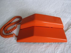 Okay, here it is my latest find and of course it is orange.  It seems that of late my eyes have this uncanny ability to seek out anything orange.  While visiting East End Estates on Kingston Road located in Toronto’s east end (see blog July 14th) I came across what I thought was the ‘jewel’ of the shop that day.  I found an ‘Eames-inspired’, orange, touch tone Contempra® telephone.  Very mod!  The Northern Electric Contempra telephone was first introduced in 1968 in a rotary dial version, with the touch tone version being released a few years later.  Inspired by the popularity of Sweden’s very cool Ericofon®, Northern Electric (Bell Canada manufacturing subsidiary) introduced the Contempra which was the first Canadian-designed telephone.  It was a very ‘ground-breaking’ style with the dial on the handset instead of the base and was available in a rainbow of colours but none best represents the ‘70’s era like the orange version.  I was so thrilled with my find so I showed it to my neighbour – a young, hip, very current, twenty-something who took a look at the very orange, heavy telephone with a long cord that plugs into a phone jack and said,  “Why?…..Is it mobile?!”
