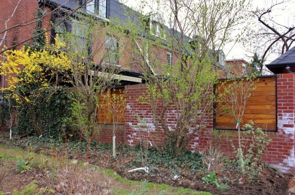 Then I came across this unique fence that appeared both traditional and contemporary in design. Built into a brick wall were panels with horizontal wood. Breaking up the hardness of a solid brick wall the wood gave a soft relief to the fence. This fence felt like English Garden meets Zen Garden. I think this backyard would be interesting to ‘room scape’ in the summer.