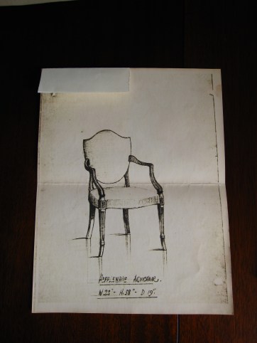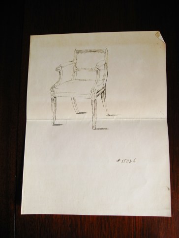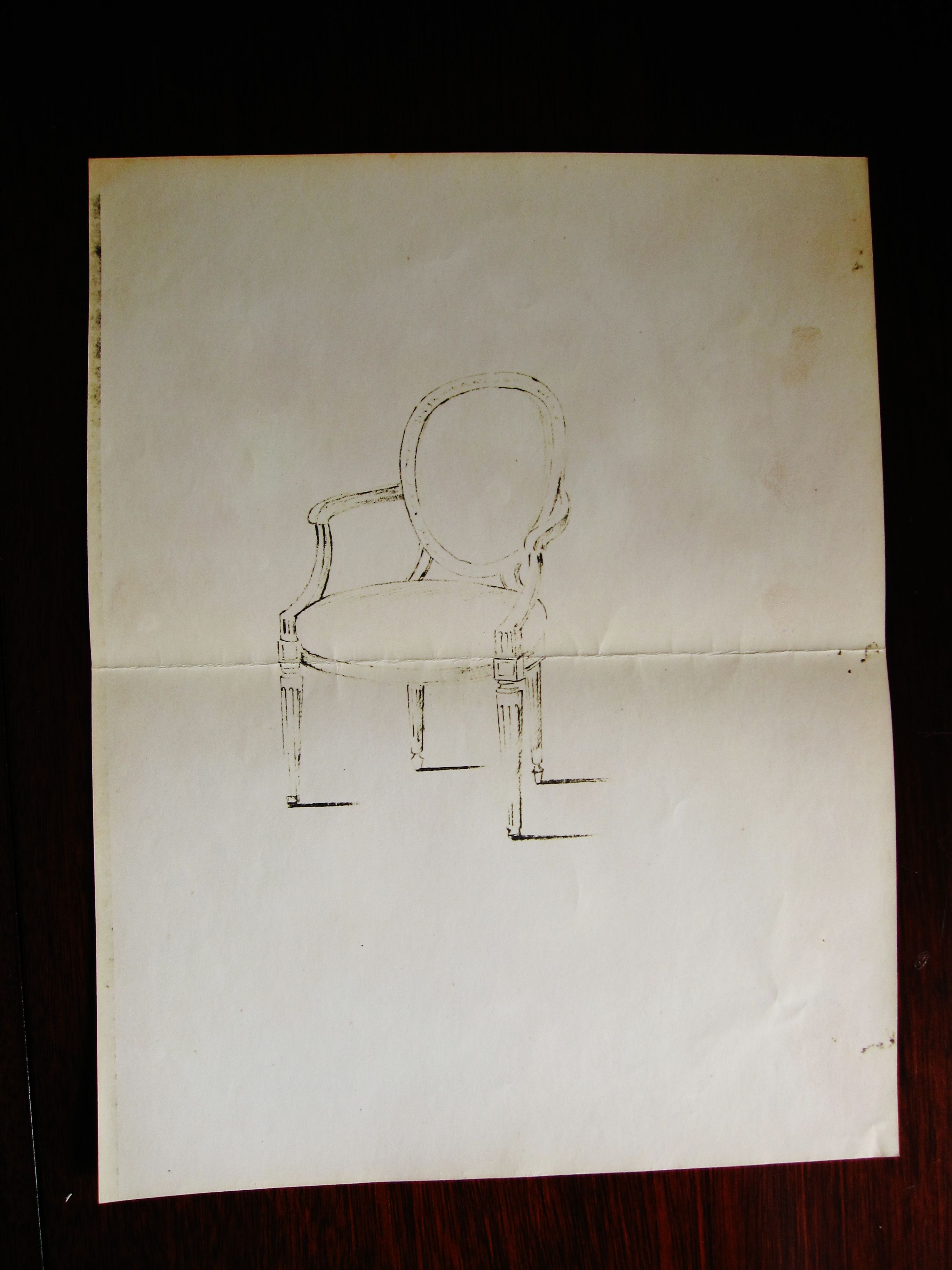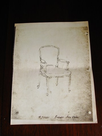 I recently wrote about the dining set I inherited from my parents.  https://modmissy.com/2012/02/23/the-dinette-table/.   The table, 6 chairs and buffet are mahogany with a French polish finish.  My mother steadfastly protected the beautiful sheen of that table and buffet. i.e. “Get your sticky fingers off that table!” (I heard that a lot growing up!)  Along with the china and silver, the buffet was the place where my mother stored her ‘important papers’.  So when I inherited the mahogany dining set I also inherited my mother’s decorating history.  Underneath the drawer liners were the receipts and invoices of many of the furniture pieces my parents had purchased over the years.  My mother took her interior decorating seriously.  She did a lot of research and inquiry before making any purchase.  In the late-1960’s my mother decided that what the living room needed was 2 occasional chairs.  So she began her research.  That research took her to The Thornton-Smith Company; Furnishers ·Decorators· Designers located on Yorkville Avenue in downtown Toronto.  Thornton-Smith was a legendary Toronto design influence that helped to single-handedly define Toronto interiors for nearly a century.  Thornton-Smith sold custom furniture, fabrics, rugs, drapery; decorated the Royal Alexander Theatre, parts of Massey Hall, the former Walker House Hotel, the Senate Chamber in Ottawa and painted stencil decoration for many Ontario churches.  For my mother Thornton-Smith provided her with 2 bergere-style chairs.  But this was the late 1960’s, long before technology, so before my mother purchased her chairs her initial inquiries, received via Canada Post, were artist sketches of the different chair designs.  From these various sketches my mother decided on 2 of the chair styles.  The first chair she chose was the chair I wrote about last April https://modmissy.com/2011/04/15/my-purple-chair/ .  I have recovered and re-stained the chair but the style is the same.  The 2nd chair I also still have.  I like to think that I not only inherited 2 nice chairs but a piece of Toronto decorating history.
