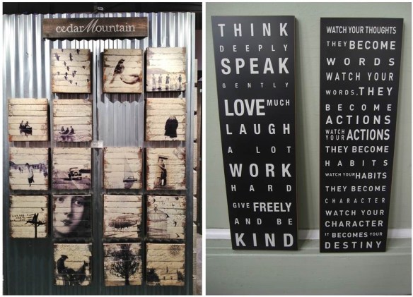 Cedar Mountain Studios  www.cedarmountainstudios.com creates wall art from reclaimed cedar boards.  In their backyard studio a team of nine artists, 2 dogs and 1 cat design and build pieces that will make you stop, read, ponder and laugh.