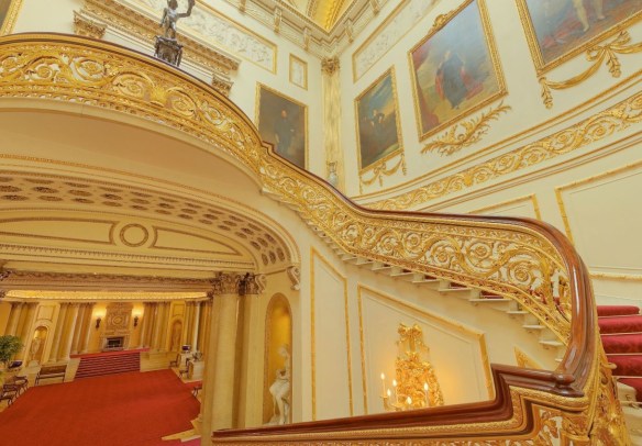 The 1st photo is of the Grand Staircase of Buckingham Palace. Notice the magnificent gilt-bronze balustrade with detailed scroll work which is duplicated in the gilt-plaster on the walls. And the larger-than life family portraits are grand in size too.