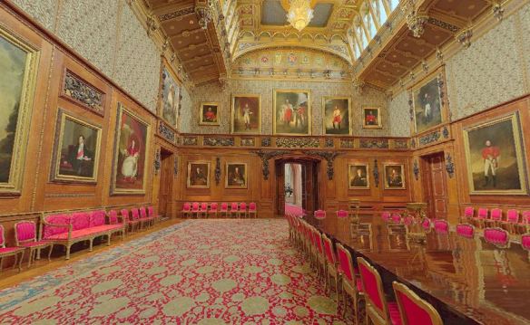 This is the Waterloo Chamber of Windsor Castle. Notice the length and shine of the very, very long table. Like all the above photos, it is the soaring ceiling heights that have me mesmerized.