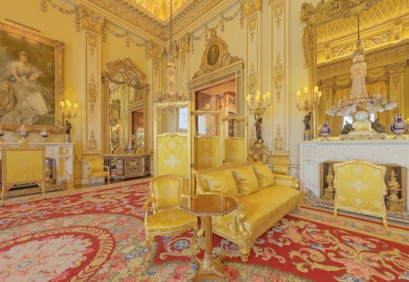 The next photo is the White Drawing Room of Buckingham Palace. The word ‘opulence’ comes to mind here. Large gilded mirrors, yellow silk, massive crystal chandeliers. Notice the doorway and the detail of the trim. Beautiful!