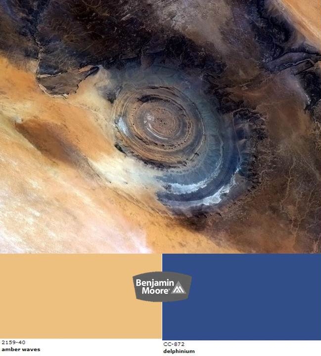 The Richat Structure, a prominent circular feature in the Sahara desert of Mauritania is a beautiful swirling composition of amber and delphinium blue.